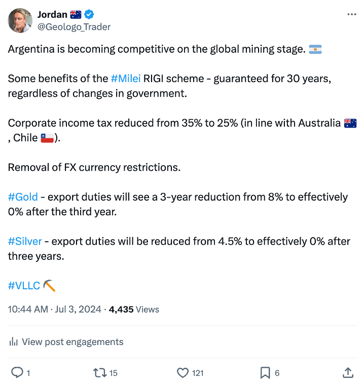 I am hopeful for the next decade-plus with commodity fundamentals, the Milei government, and the implementation of the new mining and foreign investment-friendly RIGI scheme.